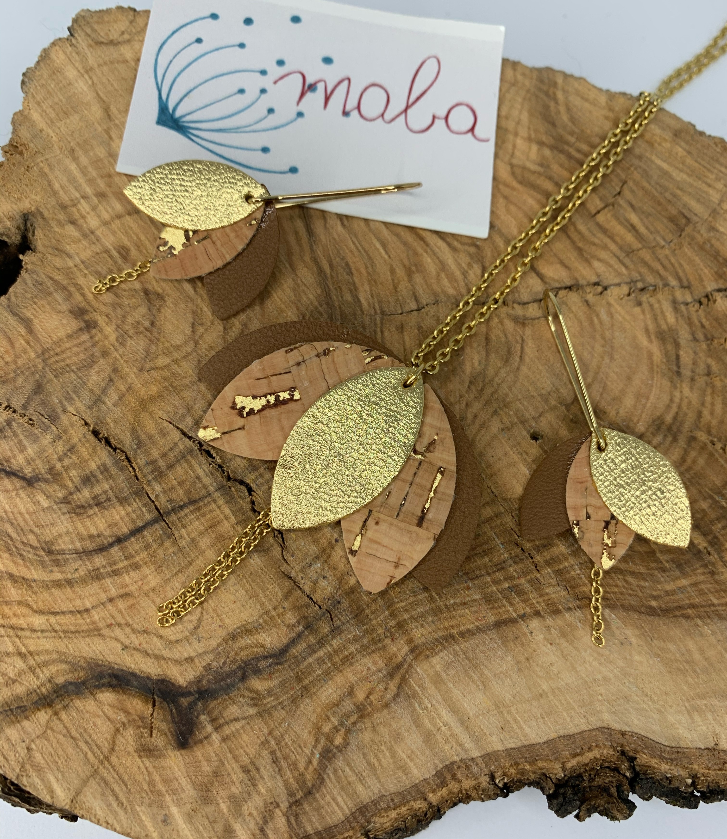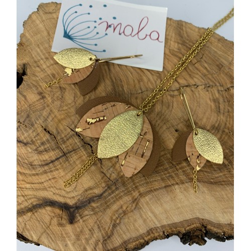 Collier en cuir doré et marron noisette, liège doré, chaîne et fermoir mousqueton en acier inoxydable couleur or.