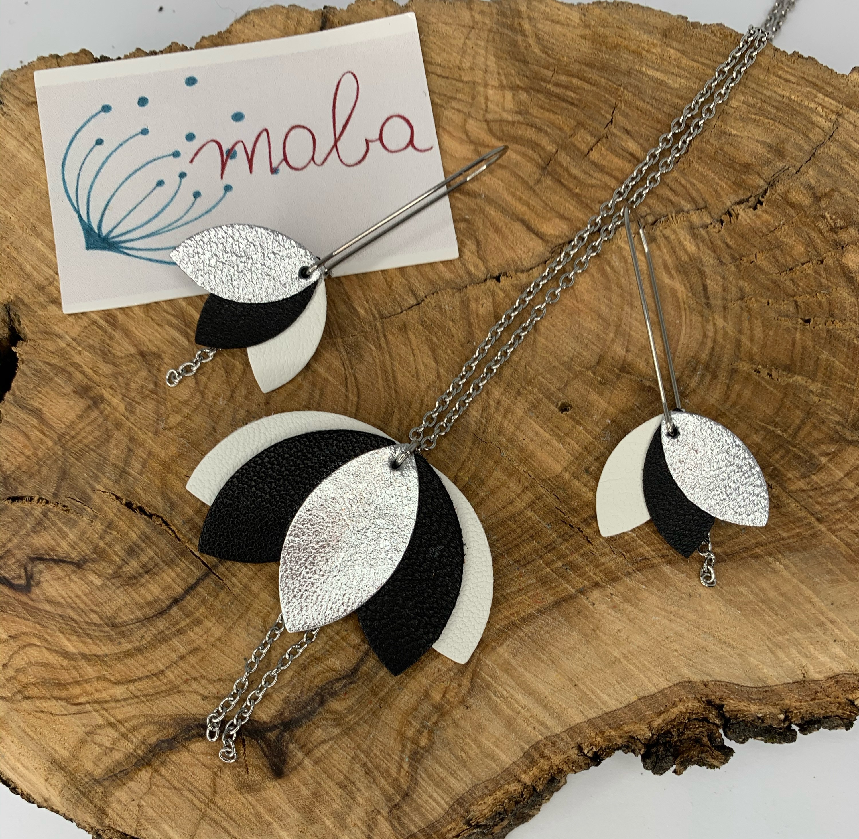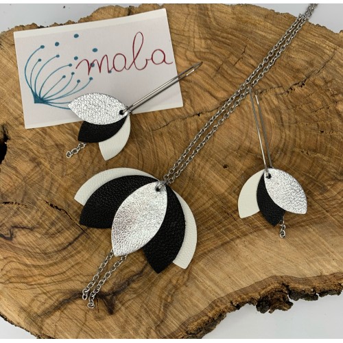Collier en cuir argent, blanc et noir, chaîne et fermoir mousqueton en acier inoxydable.