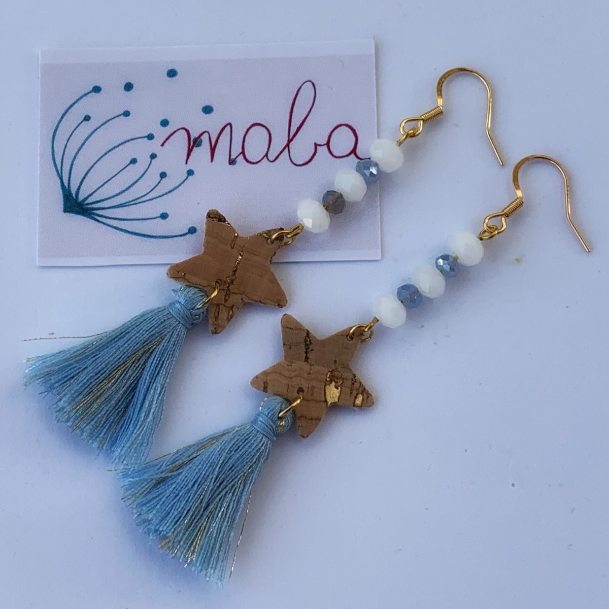 Boucles d'oreilles crochets en acier inoxydable doré, perles à facettes bleu (3x4mm) et blanches (6x4mm), étoile en liège doré (2cm) et pompon bleu et doré (3cm).